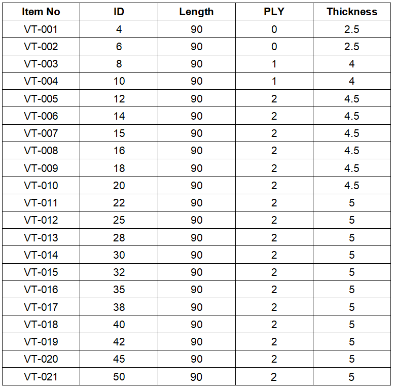 Silicone heater/vacuum hose list: